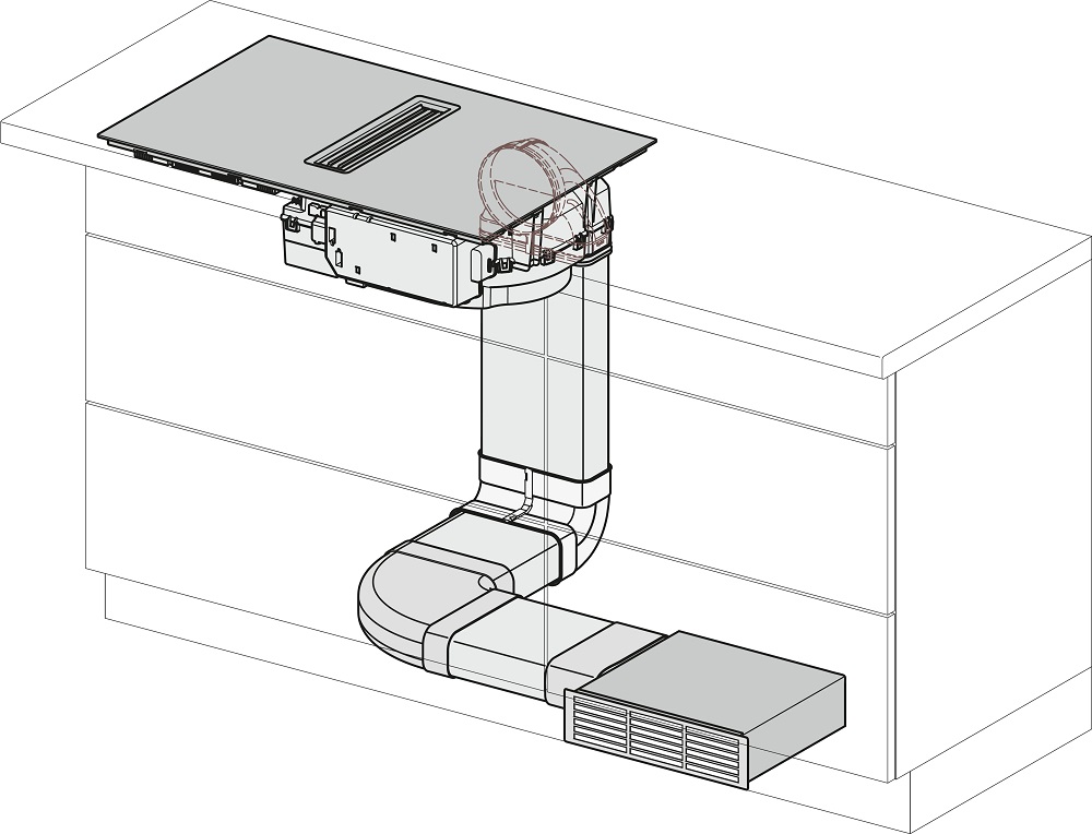 Вытяжка, встроенная в варочную панель — достаточно удобный вариант, позволяющий сэкономить место в кухне. Такая конструкция позволяет лучше улавливать испарения, не давая им распространяться по всему помещению, и способствует более качественной очистке воздуха. Большинство подобных моделей может работать только в режиме рециркуляции воздуха, с удалением капель жира, сажи, неприятных запахов при помощи системы фильтров. Работу в режиме отвода загрязненного воздуха через систему вентиляции организовать довольно сложно, поскольку вытяжка располагается низко над полом. Часто варочная панель находится на кухонном острове, что также мешает присоединению к вентиляции. Еще одна особенность подобных моделей состоит в том, что под варочной панелью нельзя разместить духовку или другую технику, так как место будет занято.