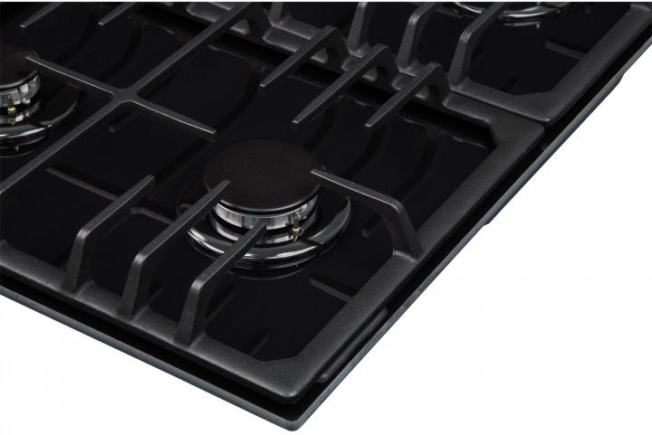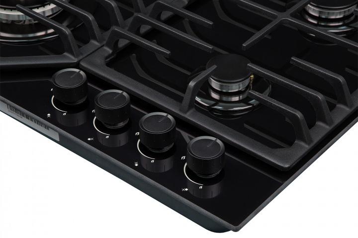 Цвет — черный. Благодаря отсутствию рамки она отлично впишется в интерьер и не займет лишнее место на столешнице, которое можно использовать для работы. Открытый огонь не страшен ни вашей посуде, ни вам, так как горелки надежно закрыты решетками. Материал самой поверхности: закаленное стекло. Управление этой моделью механическое. Для переключения уровней нагрева, выбора функций используются следующие переключатели: поворотные. Простая система контроля за прибором делают его более универсальным, ведь разобраться сможет кто угодно.