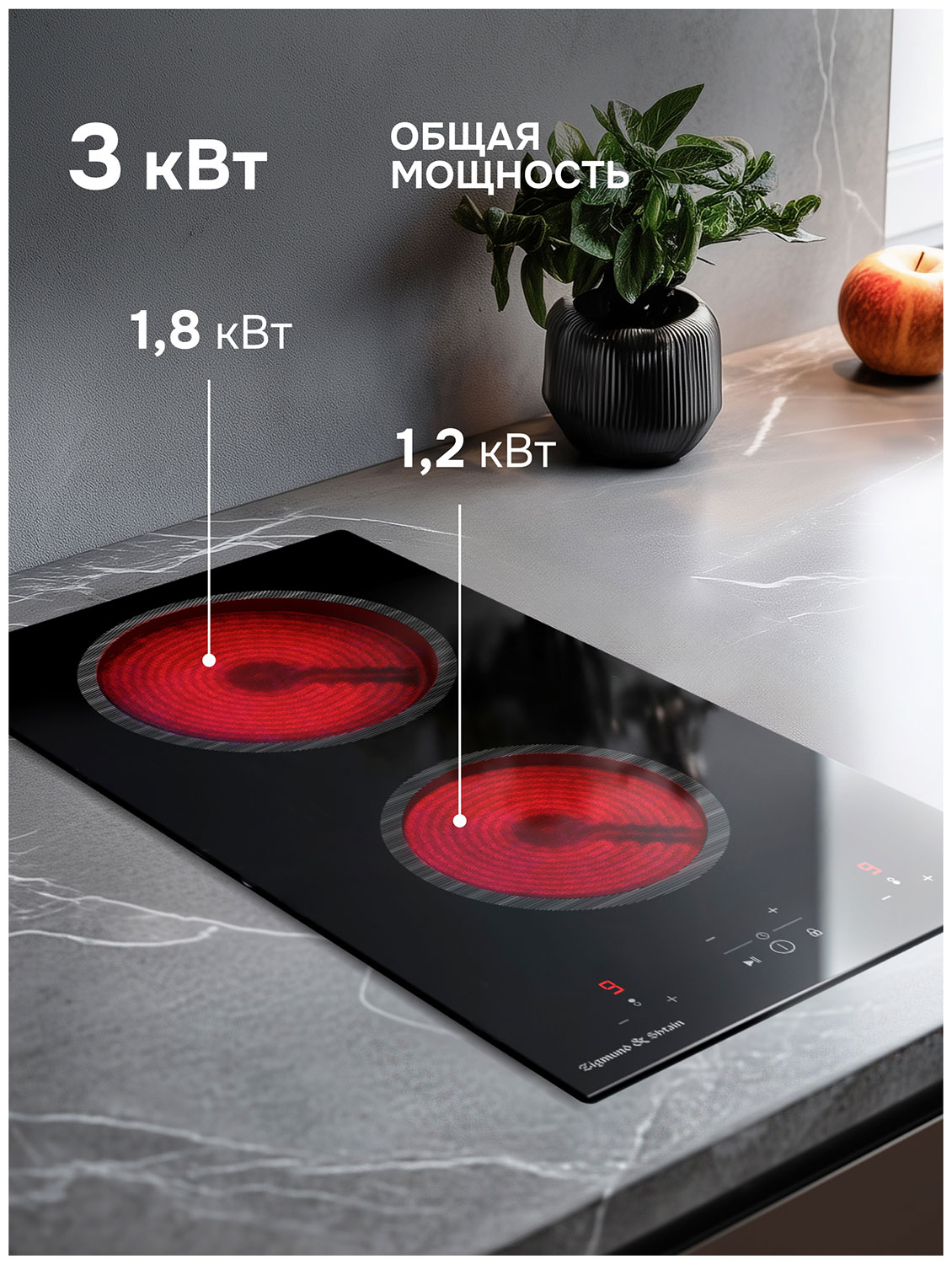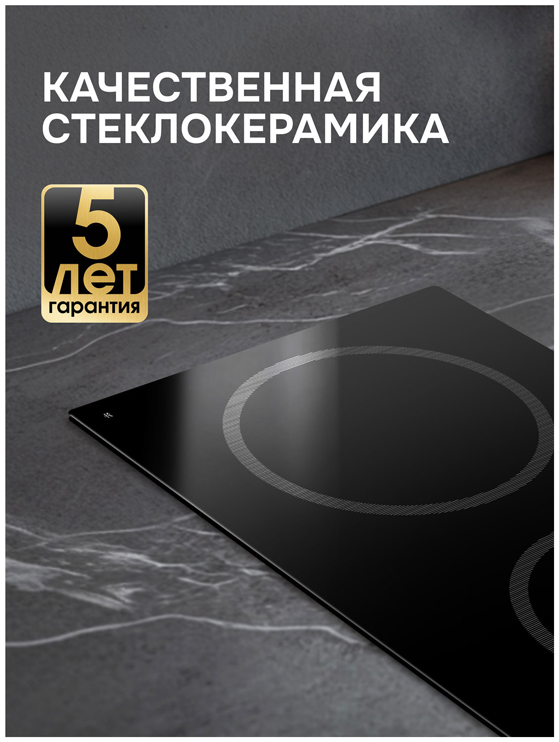 Варочная панель имеет стеклокерамическую поверхность, которая хорошо проводит тепло и быстро нагревает посуду. При этом достаточно прочная и безопасная в использовании. Количество конфорок в этой модели: 2.