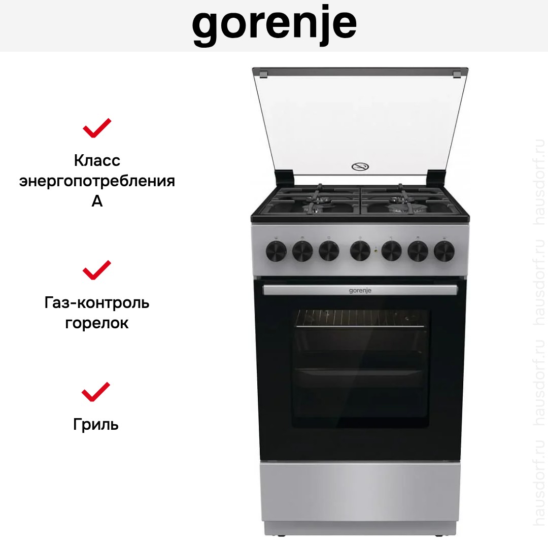 Комбинированная плита Gorenje GK5B44SF объединяет в одном корпусе газовую варочную поверхность и электрическую духовку, предлагая сбалансированное сочетание мощности и точного управления. Корпус серебристого цвета с фурнитурой в тон смотрится современно и аккуратно в любой кухне. Высота 85 см и ширина 50 см делают прибор удобным для стандартных ниш, а глубина 59,4 см обеспечивает компактность без потери функционала.