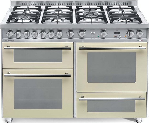 Устройства с тремя духовками также имеют один основной и две дополнительных шкафа разного объема: например, плиты Bertazzoni оснащены большой духовкой объемом 69 литров, средней объемом 54 литра и малой объемом 24 литра. Духовки располагаются в два ряда: две меньшие духовки в одном ряду, большая и ящик для посуды в другом.