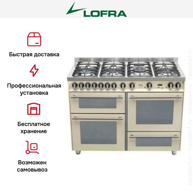 Комбинированная плита Lofra PBI26SMFE — находка для больших семей и полупрофессиональных поваров, которые работают на дому. В трех духовках можно готовить одновременно мясо и овощи, пиццу и пироги и т. д. В комплекте чугунные решетки для варочной поверхности, глубокие противни и решетка WOK.