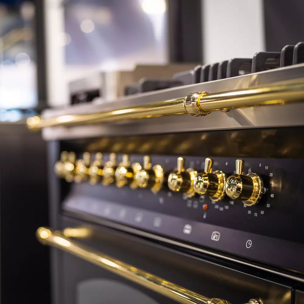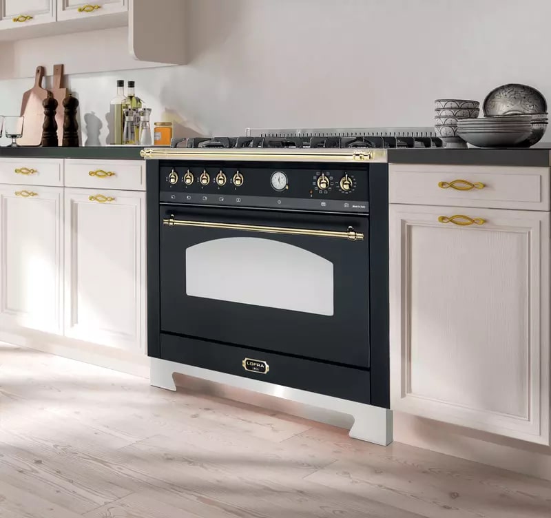 Гораздо разнообразнее представлена фурнитура в моделях в классическом, средиземноморском, деревенском или ретро-дизайне. Так, модели производства Lofra оснащаются фигурными рейлингами и поворотными переключателями цвета латуни, состаренного серебра, хрома, золота. В варочных центрах La Cornue интерес представляет круглая накладная ручка дверцы духовки серебристого цвета. Фурнитурой в стиле ретро оснащаются варочные центры производства Smeg, Kaiser, Bertazzoni, но особенно разнообразны и оригинальны модели производства итальянской компании Restart с фурнитурой из меди и латуни. Каждая такая модель изготавливается по индивидуальному проекту, и покупатель может выбрать цвет и форму переключателей, дверцы и ручек духовых шкафов и другие элементы дизайна.