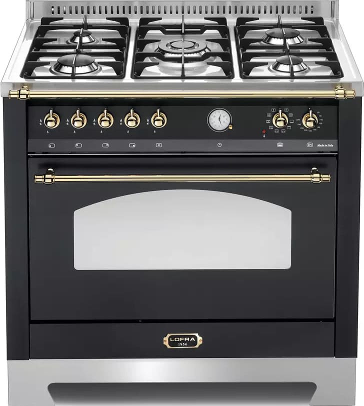 Устройства с тремя духовками также имеют один основной и две дополнительных шкафа разного объема: например, плиты Bertazzoni оснащены большой духовкой объемом 69 литров, средней объемом 54 литра и малой объемом 24 литра. Духовки располагаются в два ряда: две меньшие духовки в одном ряду, большая и ящик для посуды в другом.