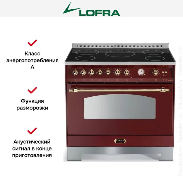 Электрическая плита Lofra RRG96MFT/5I — отличный выбор как для квартиры, так и для частного дома. Цвет корпуса бордо, он гармонично сочетается с мебелью и техникой похожих оттенков, а также может интересно выглядеть на контрасте с ними. Для управления используется удобная и понятная электронно-механическая система. Благодаря ей выбирать режимы приготовления и настраивать параметры температуры очень просто. Переключатели не только выполняют техническую функцию, но и поддерживают общий дизайн; тип элементов: поворотные + кнопки.