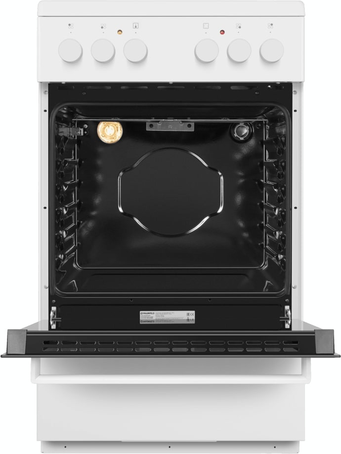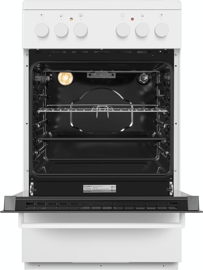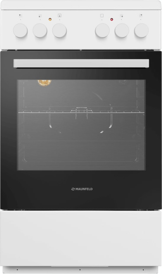 Электрическая плита Maunfeld MEC55CW07 — отличный выбор как для квартиры, так и для частного дома. Цвет корпуса белый, он гармонично сочетается с мебелью и техникой похожих оттенков, а также может интересно выглядеть на контрасте с ними. На внутренней поверхности двери расположена таблица доступных рецептов — полезная и необычная фишка. Для управления используется удобная и понятная механическая система. Благодаря ей выбирать режимы приготовления и настраивать параметры температуры очень просто. Переключатели не только выполняют техническую функцию, но и поддерживают общий дизайн; тип элементов: поворотные.