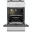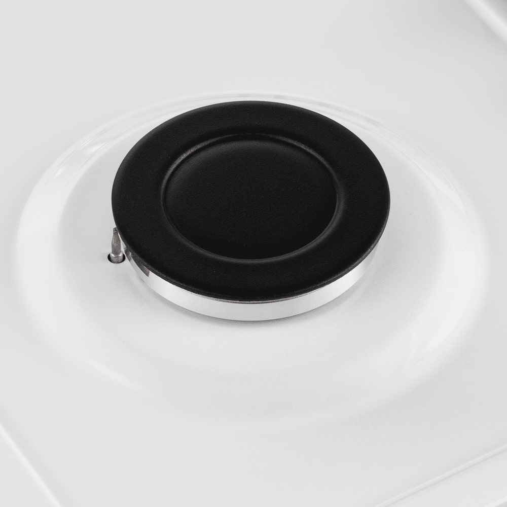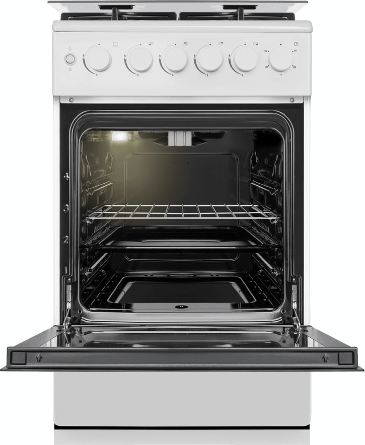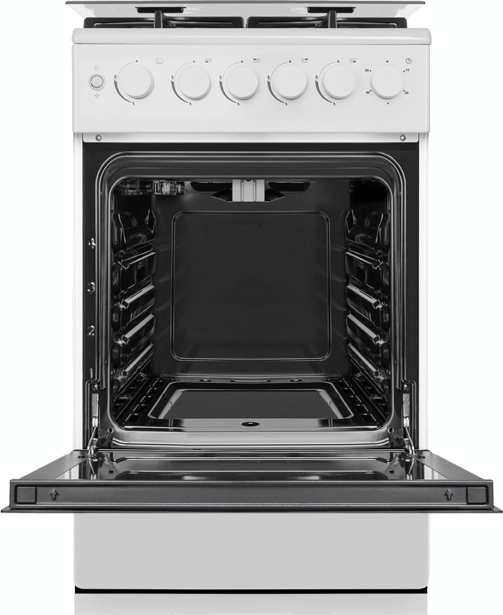 По функционалу это газовая модель с одной духовкой объёмом 59 л и четырьмя газовыми конфорками: передняя левая 2.7 кВт, задние по 1.7 кВт и передняя правая 1 кВт. Варочная поверхность — эмалированный металл, оснащён автоматическим электроподжигом конфорок и газ-контролем горелок. Духовка газовая, с электрическим электроподжигом, газ-контролем камеры и газовым грилем мощностью 1.1 кВт; доступно два режима работы: нижний нагрев и гриль, плюс свет внутри камеры. Температуру можно регулировать в диапазоне 150-230 °C, при этом верхний нагревательный элемент развивает 1100 Вт, нижний — 2350 Вт, максимальная заявленная температура — 230 °C. Для удобства есть механический таймер и четыре уровня приготовления на рельефных направляющих. Очистка камеры — паровая, внутреннее покрытие — эмаль лёгкой очистки.