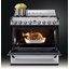 Устройства с тремя духовками также имеют один основной и две дополнительных шкафа разного объема: например, плиты Bertazzoni оснащены большой духовкой объемом 69 литров, средней объемом 54 литра и малой объемом 24 литра. Духовки располагаются в два ряда: две меньшие духовки в одном ряду, большая и ящик для посуды в другом.