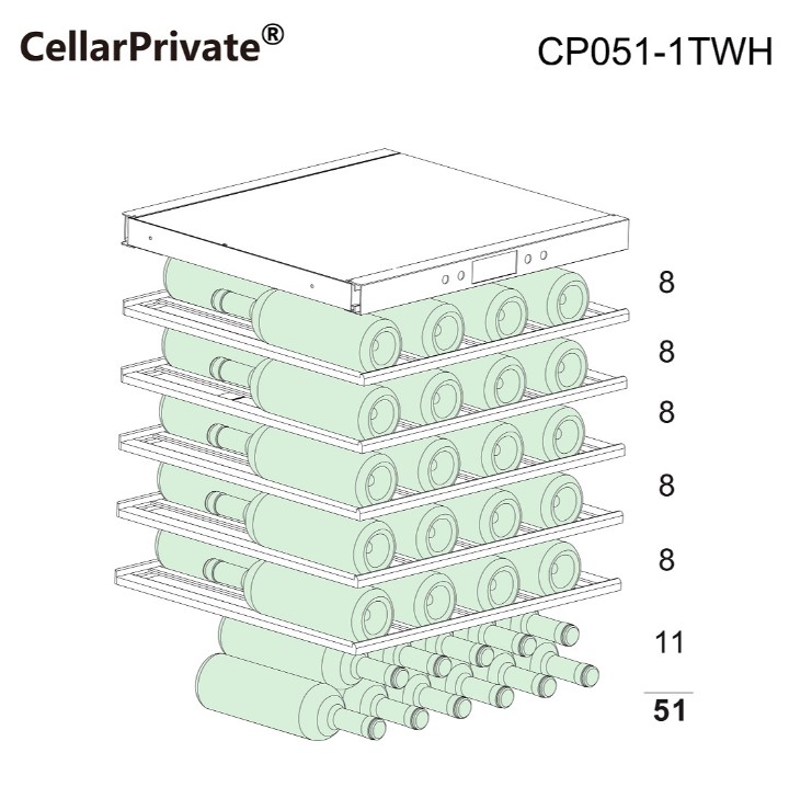 Винный холодильник CellarPrivate CP051-1TWH имеет одну температурную зону, в которой можно разместить бутылки и единовременно выставить только одну комбинацию настроек. Он встраивается в нишу, что удобно, если у вас ограничен метраж помещения. Благодаря компактным размерам данная модель — отличный выбор для офиса, гостиничного номера. Количество бутылок, которое можно разместить с учетом полной комплектации и из расчета объема бутылки 0,75 л, — 51 шт.