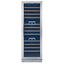 Стеклянная дверь — дополнительный изящный штрих к общему дизайну модели. Специальное покрытие защищает вино от влияния ультрафиолетовых лучей, которые проникают, если шкаф находится в солнечной комнате. Цвет корпуса — металл. Дверь можно перевесить на другую сторону, поэтому вариантов размещения его в доме становится больше.