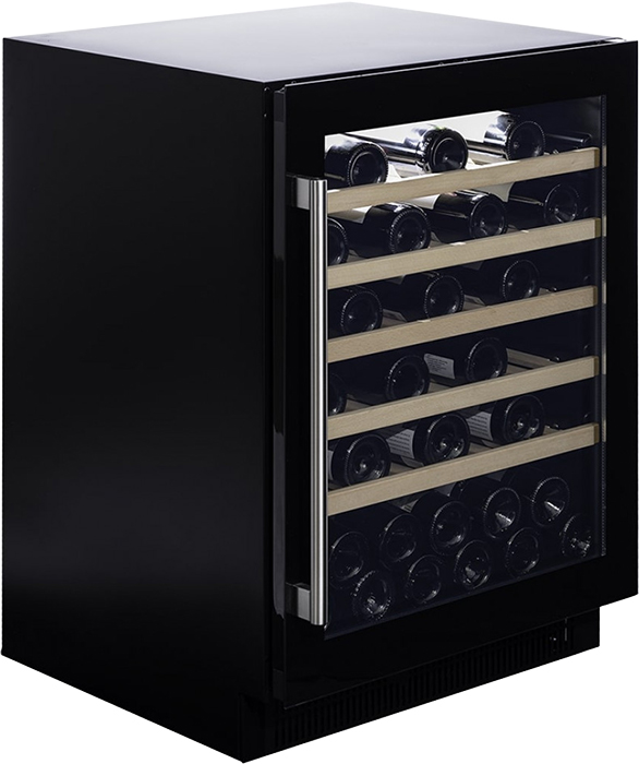 Стеклянная дверь — дополнительный изящный штрих к общему дизайну модели. Специальное покрытие защищает вино от влияния ультрафиолетовых лучей, которые проникают, если шкаф находится в солнечной комнате. Хранение становится еще безопаснее и герметичнее благодаря нескольким слоям стекол. Цвет корпуса — черный матовый. Дверь можно перевесить на другую сторону, поэтому вариантов размещения его в доме становится больше.