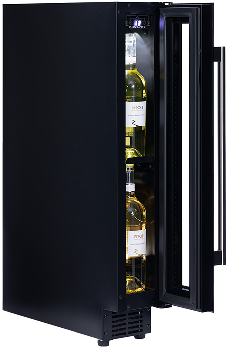Дверца у большинства винных шкафов изготавливается из многослойного тонированного стекла. Такой материал, с одной стороны, позволяет оценивать коллекцию вин визуально, не открывая дверцу, в условиях стабильной температуры и влажности. С другой стороны, затемненное стекло с УФ-фильтром в виде напыления или специальной пленки надежно изолирует винные бутылки негативного воздействия ультрафиолетового излучения. Несколько слоев стекла обеспечивают при этом дополнительную защиту. Очень часто стекло в дверце заключается в рамку из дерева или металла. Натуральный или окрашенный металл или дерево не только способствуют прочности конструкции, но и превращают винный холодильник, особенно отдельно стоящий, в эффектный элемент обстановки.
