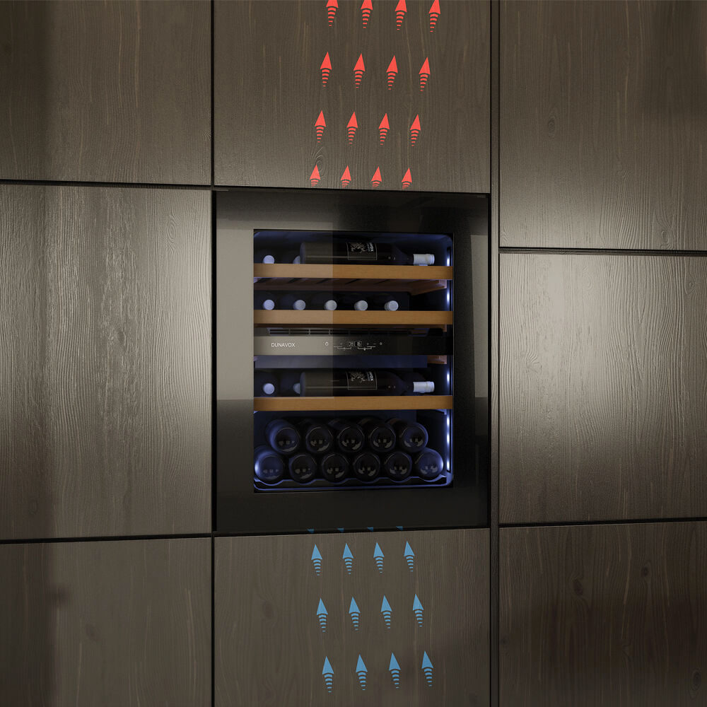 Вентиляция в винных шкафах необходима для сохранения качества вина: они предотвращает появление неприятных запахов, исключает образование плесени, а также поддерживает постоянную температуру во всем пространстве рабочей камеры. Большинство холодильников для вина оснащается принудительной вентиляцией, а также угольными фильтрами, нейтрализующими посторонние запахи. Тип вентиляции зависит от вида самого устройства. Отдельно стоящие компрессорные винные шкафы обычно имеют систему вентиляции, расположенную на задней стенке. Их можно устанавливать отдельно или в нише, при условии, что с каждой стороны будет обеспечено достаточное свободное пространство не менее 5 см. Таким образом гарантируется свободная циркуляция воздуха. Все термоэлектрические винные шкафы нельзя монтировать в нишу или колонну — они устанавливаются только самостоятельно.