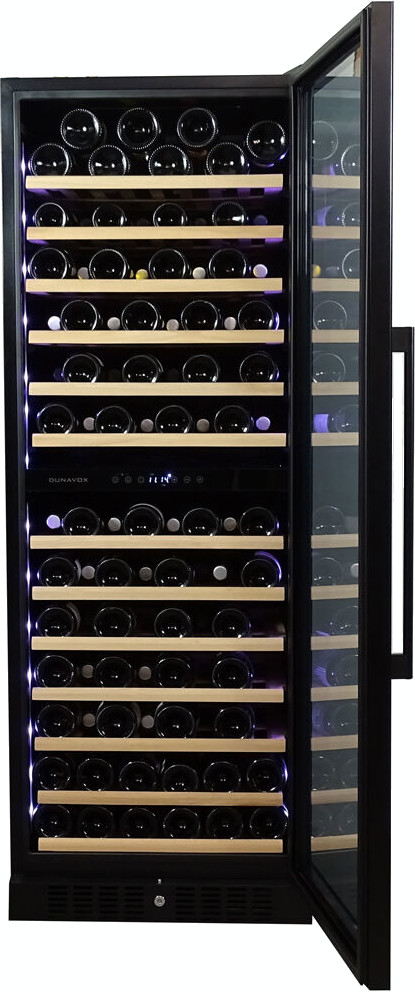 Винный холодильник Dunavox DX-108.330DC имеет две температурные зоны, в которых одновременно можно хранить разные сорта алкоголя и выставлять разные сочетания настроек. Он устанавливается отдельно, что удобно, если у вас есть специальное помещение — кладовая, погреб и т.д. Количество бутылок, которое можно разместить с учетом полной комплектации и из расчета объема бутылки 0,75 л, — 108 шт.
