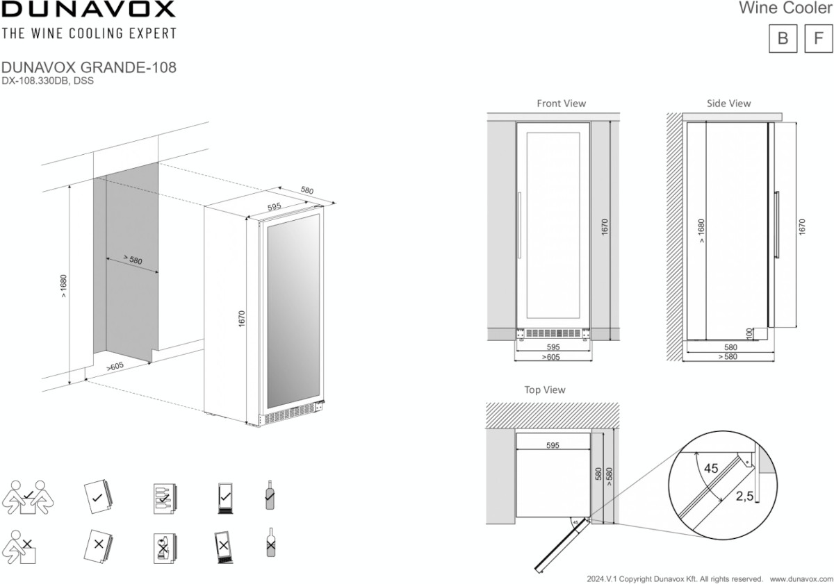 Некоторые отдельно стоящие винные шкафы, а также модели, встраиваемые в мебельную колонну, шкаф или другое закрытое пространство, оснащаются системой забора воздуха и вентиляционной решеткой, расположенными спереди в нижней части корпуса. Зазоры между корпусом шкафа и стенками мебели необходимы и в этом случае.