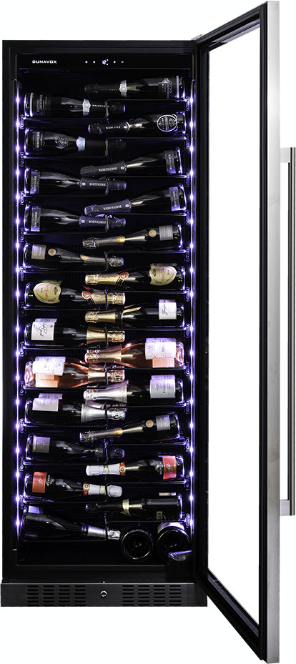 Винный холодильник Dunavox DX-143.468C имеет одну температурную зону, в которой можно разместить бутылки и единовременно выставить только одну комбинацию настроек. Он устанавливается отдельно, что удобно, если у вас есть специальное помещение — кладовая, погреб и т.д. Количество бутылок, которое можно разместить с учетом полной комплектации и из расчета объема бутылки 0,75 л, — 143 шт.