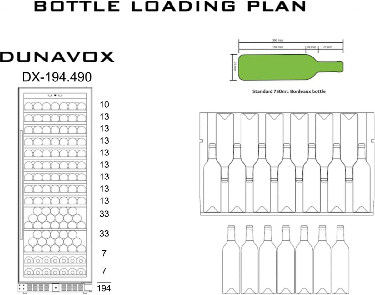 Стандартная вместительность рассчитывается по количеству бутылок «Бордо» 0,75 л. Это число также показывает максимальную загрузку при полной комплектации (полок, ящиков и других элементов).