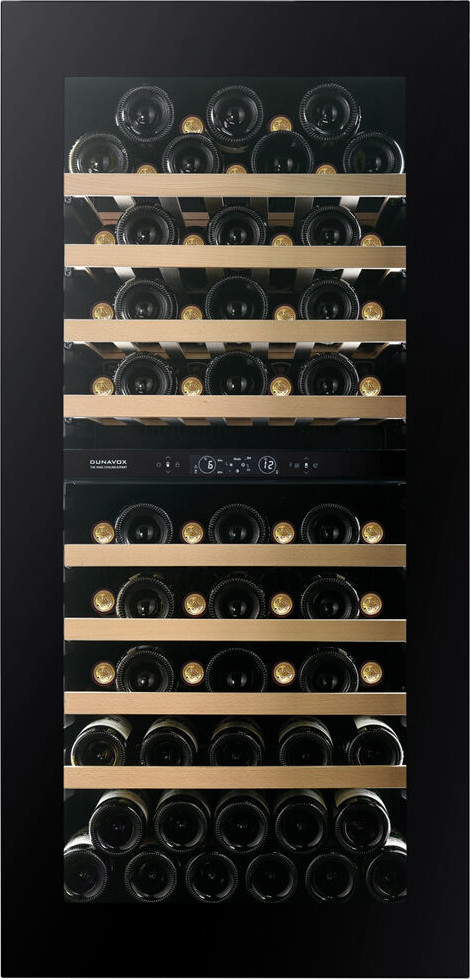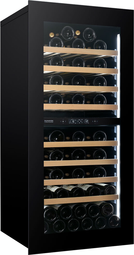 Винный холодильник Dunavox DVH-70.185DMB.TO имеет две температурные зоны, в которых одновременно можно хранить разные сорта алкоголя и выставлять разные сочетания настроек. Он встраивается в нишу, что удобно, если у вас ограничен метраж помещения. Количество бутылок, которое можно разместить с учетом полной комплектации и из расчета объема бутылки 0,75 л, — 70 шт.