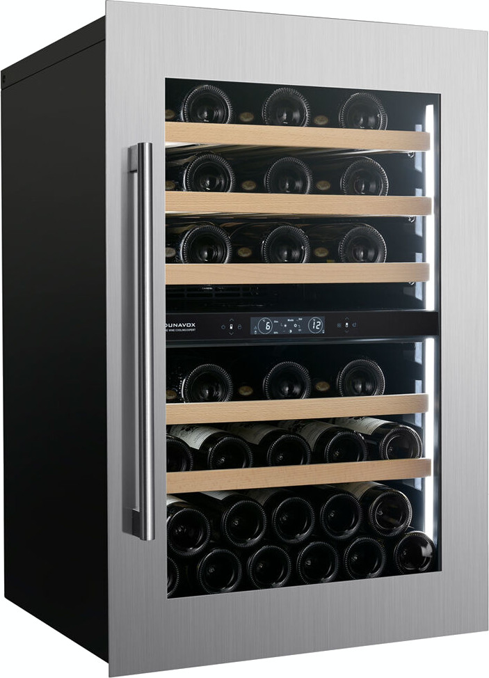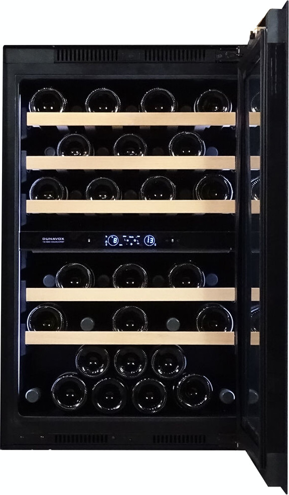 Винный холодильник Dunavox DVS-44.120DC имеет две температурные зоны, в которых одновременно можно хранить разные сорта алкоголя и выставлять разные сочетания настроек. Он встраивается в нишу, что удобно, если у вас ограничен метраж помещения. Благодаря компактным размерам данная модель — отличный выбор для офиса, гостиничного номера. Количество бутылок, которое можно разместить с учетом полной комплектации и из расчета объема бутылки 0,75 л, — 44 шт.