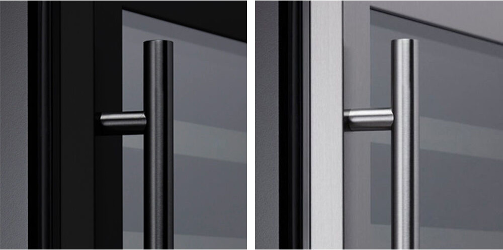 Вид и расположение ручки на дверце винного шкафа зависит прежде всего от дизайна и стиля изделия. В классических холодильниках со корпусом из дерева чаще всего используется внешняя ручка «под старину», изготовленная из металла — например, латуни, под бронзу или медь. Модели в современном стиле оснащаются внешними ручками из металла, выполненными в минималистическом стиле, или скрытыми ручками, создающими снаружи гладкую поверхность, за которой легко ухаживать. Некоторые производители предлагают винные шкафы без ручек: дверца у них открывается нажатием на среднюю или верхнюю часть.