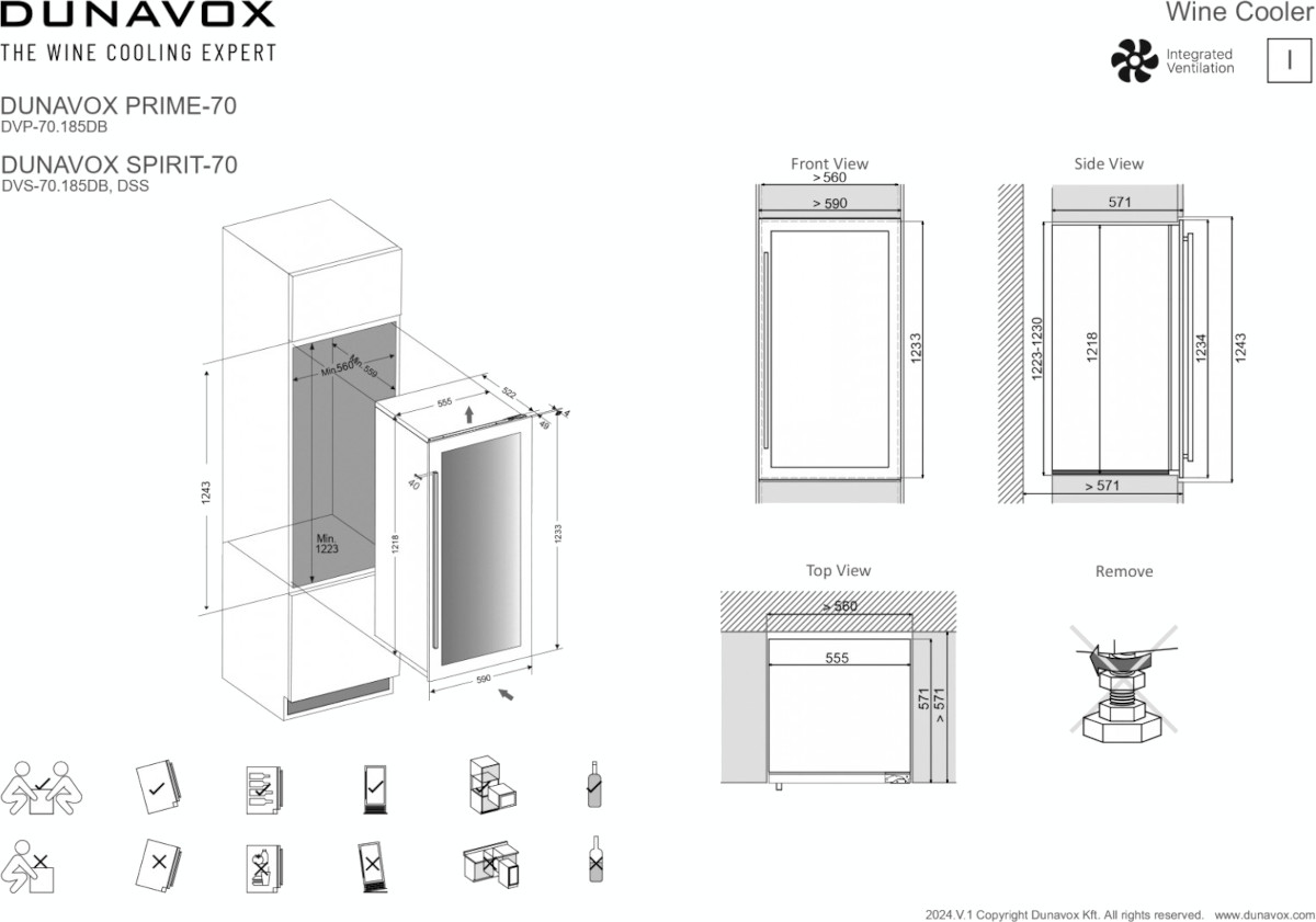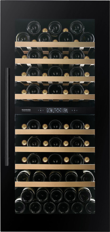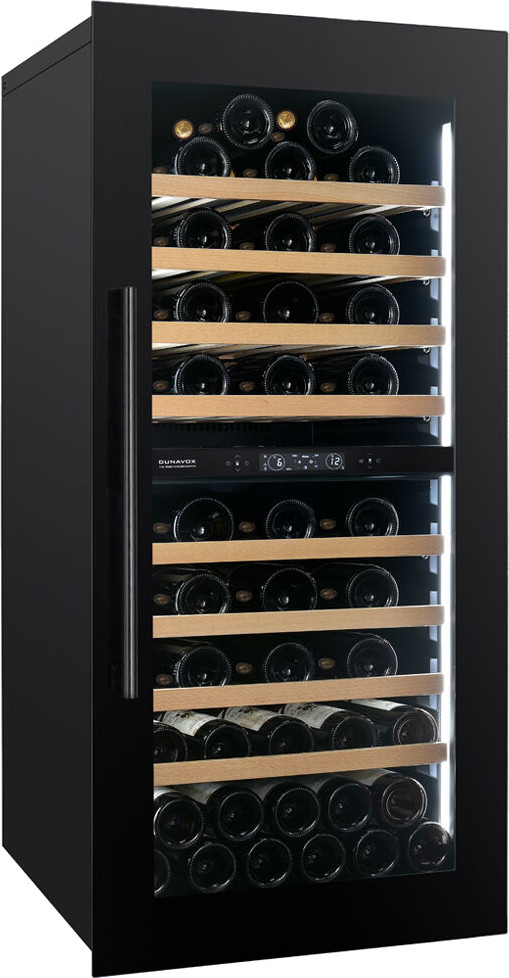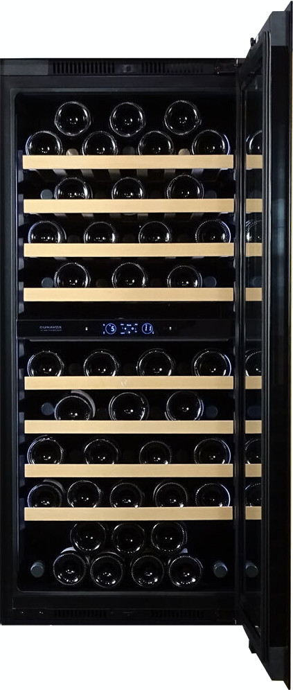 Винный холодильник Dunavox DVS-70.185DMB имеет две температурные зоны, в которых одновременно можно хранить разные сорта алкоголя и выставлять разные сочетания настроек. Он встраивается в нишу, что удобно, если у вас ограничен метраж помещения. Количество бутылок, которое можно разместить с учетом полной комплектации и из расчета объема бутылки 0,75 л, — 70 шт.