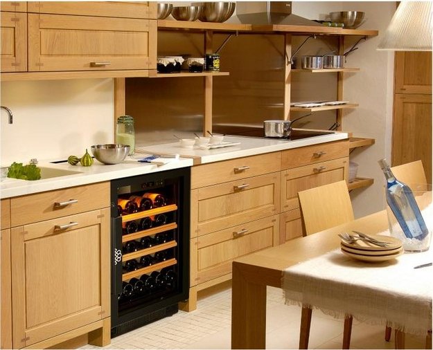 Встраиваемые холодильники для вина оснащаются специальной системой вентиляции: охлаждающая система у них находится в нижней части корпуса спереди. На такие устройства не навешивается мебельный фасад: дверца с затемненным стеклом остается на виду и открывается на достаточно широкий угол для свободного выдвижения деревянных полок.