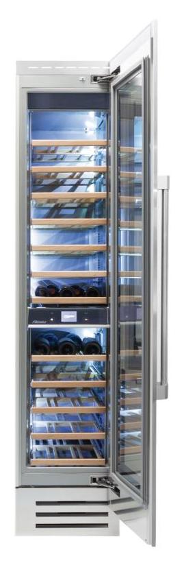 Ширина винного шкафа, как и другие их габариты, обязательно учитывается при выборе модели для домашнего или профессионального использования. Встраиваемые и отдельно стоящие модели выпускаются в самом широком ассортименте, так что разброс значений максимально велик. Неизменным спросом пользуются винные шкафы стандартной ширины — от 40 до 80 см, в современном и классическом стиле. Для встраиваемых шкафов наиболее удобной является ширина 60 см, позволяющая устанавливать их в кухонную тумбу или колонну. Вместимость их может быть самой различной и зависит в большей степени от высоты прибора. Маленькие винные шкафы с размещением на столешнице или даже с креплением к стене, рассчитанные на хранение от одной до десяти бутылок, могут иметь минимальную ширину от 13 см. На полках у них обычно помещается не более 5 бутылок, и используются они для охлаждения вина перед подачей. Большие винные шкафы с несколькими камерами и температурными зонами для длительного хранения и созревания разных сортов вина могут иметь ширину до 180 см, а максимальное значение этого параметра может составить 300 см. Как правило, это отдельно стоящие модели в деревянном корпусе с камерами side-by-side.