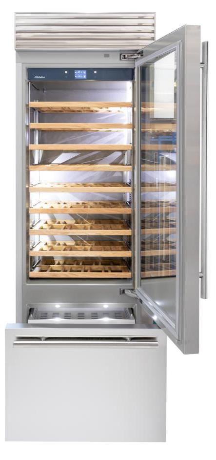 Винный холодильник Fhiaba XS750TWT6 имеет две температурные зоны, в которых одновременно можно хранить разные сорта алкоголя и выставлять разные сочетания настроек. Он встраивается в нишу, что удобно, если у вас ограничен метраж помещения. Количество бутылок, которое можно разместить с учетом полной комплектации и из расчета объема бутылки 0,75 л, — 81 шт.