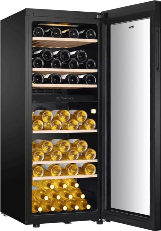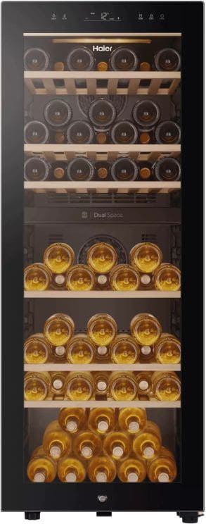 Винный холодильник Haier FWC77GDAU1 имеет две температурные зоны, в которых одновременно можно хранить разные сорта алкоголя и выставлять разные сочетания настроек. Он устанавливается отдельно, что удобно, если у вас есть специальное помещение — кладовая, погреб и т.д. Количество бутылок, которое можно разместить с учетом полной комплектации и из расчета объема бутылки 0,75 л, — 77 шт.