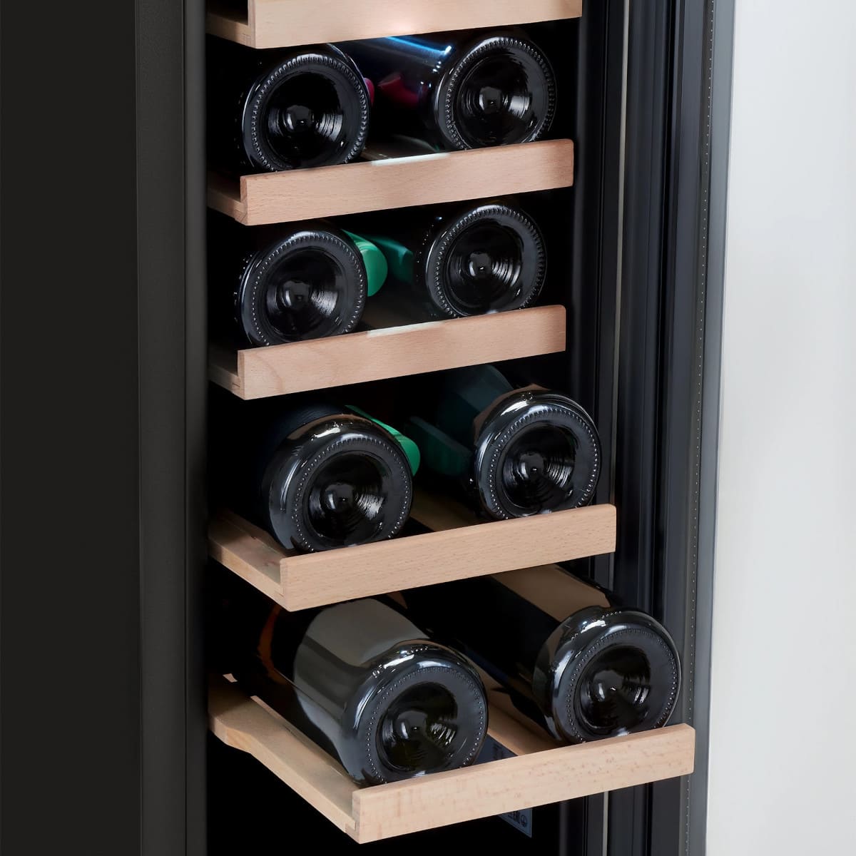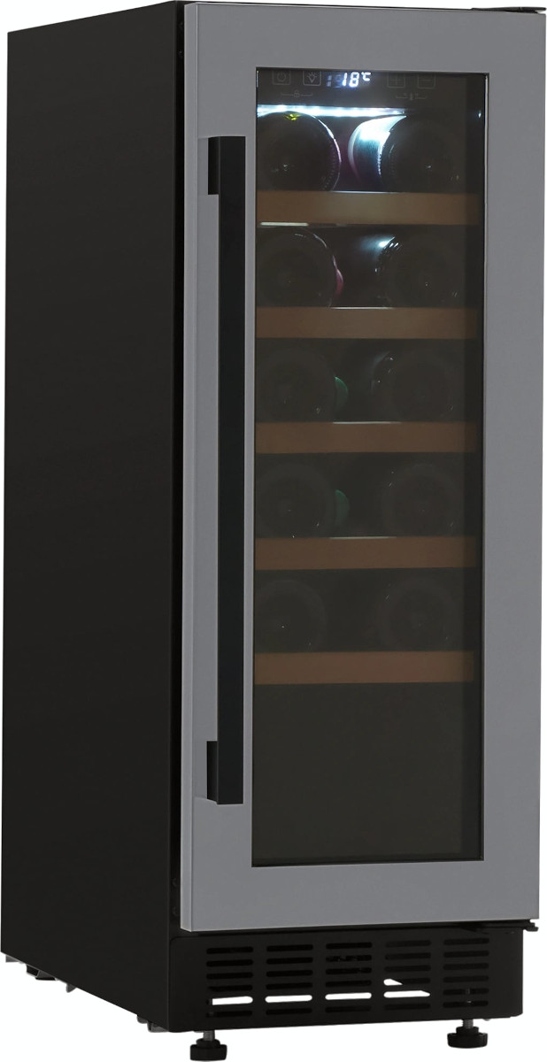 Дверца у большинства винных шкафов изготавливается из многослойного тонированного стекла. Такой материал, с одной стороны, позволяет оценивать коллекцию вин визуально, не открывая дверцу, в условиях стабильной температуры и влажности. С другой стороны, затемненное стекло с УФ-фильтром в виде напыления или специальной пленки надежно изолирует винные бутылки негативного воздействия ультрафиолетового излучения. Несколько слоев стекла обеспечивают при этом дополнительную защиту. Очень часто стекло в дверце заключается в рамку из дерева или металла. Натуральный или окрашенный металл или дерево не только способствуют прочности конструкции, но и превращают винный холодильник, особенно отдельно стоящий, в эффектный элемент обстановки.