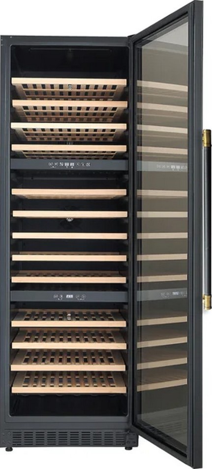 Особенность этой модели — мультитемпературная система с тремя независимыми зонами в единой камере, управляемой компрессорным охлаждением, обеспечивающим стабильность и долговечность работы. Верхний и нижний отсеки позволяют поддерживать температуру в диапазоне от 12 до 22 C, что идеально подходит для хранения красных вин, которым требуется тёплый, но не жаркий режим. Средняя зона, в свою очередь, охлаждается до 5–12 C, создавая оптимальные условия для белых, розовых и игристых напитков, которым необходим более прохладный климат.