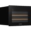 Встраиваемые холодильники для вина оснащаются специальной системой вентиляции: охлаждающая система у них находится в нижней части корпуса спереди. На такие устройства не навешивается мебельный фасад: дверца с затемненным стеклом остается на виду и открывается на достаточно широкий угол для свободного выдвижения деревянных полок.