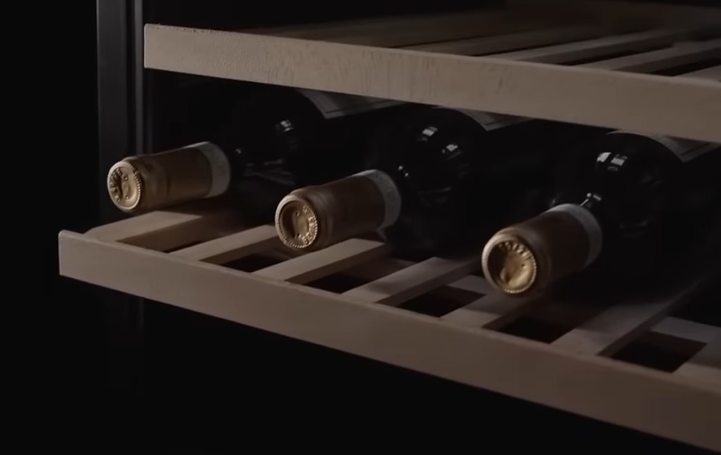 Деревянные полки — классический вариант для винных шкафов. Они поглощают вибрацию, хорошо выдерживают влажность больше 60% и надежно поддерживают бутылки как при параллельном, так и при перпендикулярном хранении. Они изготавливаются из разных пород, часто встречается массив бука.