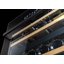 Встраиваемые холодильники для вина оснащаются специальной системой вентиляции: охлаждающая система у них находится в нижней части корпуса спереди. На такие устройства не навешивается мебельный фасад: дверца с затемненным стеклом остается на виду и открывается на достаточно широкий угол для свободного выдвижения деревянных полок.