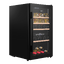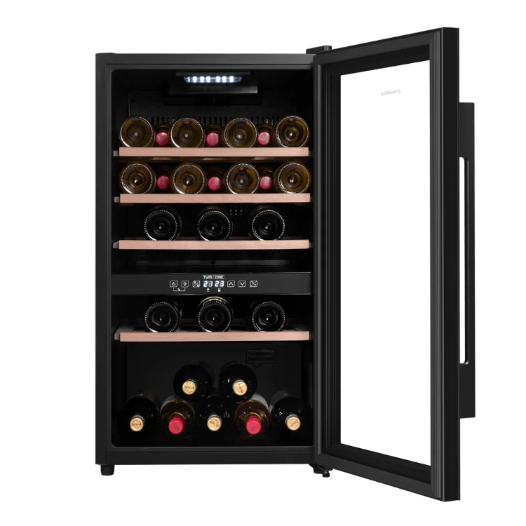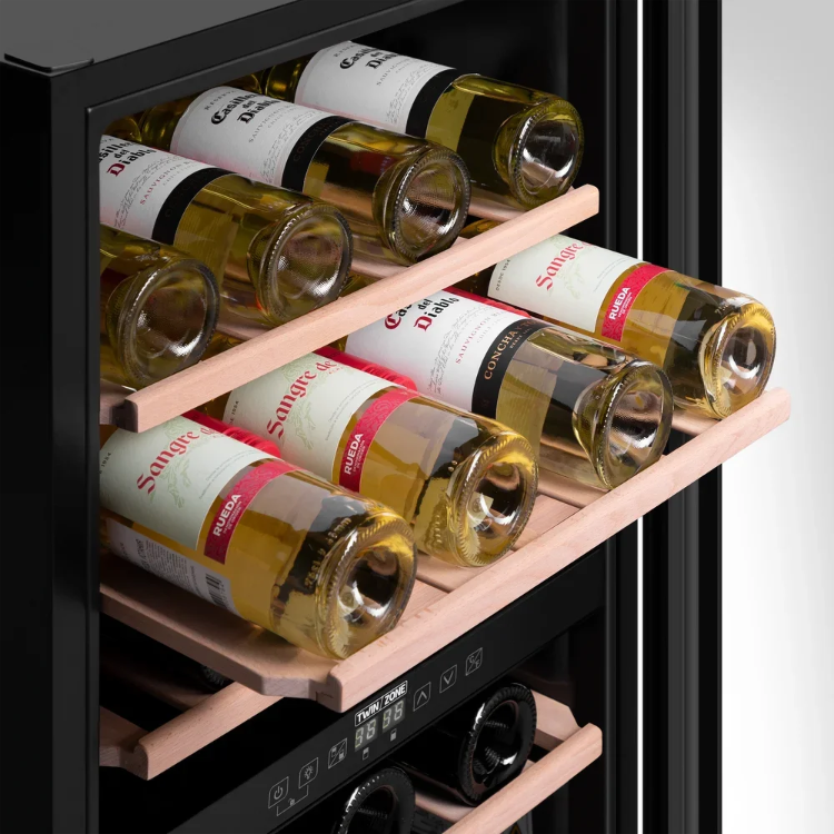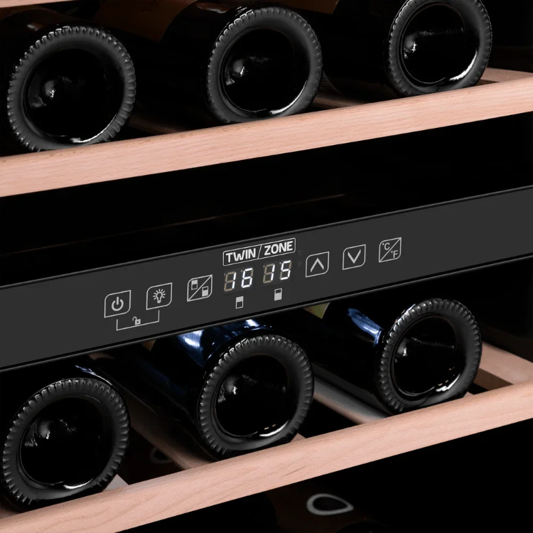 Аппарат оснащён двумя температурными зонами с диапазоном 5-22 °C, что даёт возможность одновременно хранить красные и белые вина при оптимальных условиях. Диапазон влажности 50-80% поддерживает пробки в хорошем состоянии, не допуская их пересыхания. Компрессорное охлаждение на базе стандартного компрессора обеспечивает стабильную работу, а хладагент R600a отличается эффективностью и низким уровнем воздействия на окружающую среду. Встроенный электронный термостат вместе с сенсорным управлением и цифровым дисплеем обеспечивает точную настройку параметров и быстрый контроль.