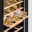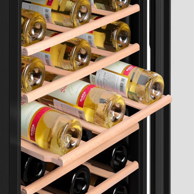 Внутреннее пространство на 201 литр рассчитано на 84 бутылки стандартного объема 0,75 л, что делает шкаф подходящим для частных коллекций и небольших заведений. Десять полок из бука придают оформлению теплоту и натуральную текстуру, одновременно мягко фиксируя бутылки. Светодиодное освещение равномерно подсвечивает содержимое, не нагревая его и не искажая оттенки вина. Встроенная вентиляция поддерживает циркуляцию воздуха и помогает избежать застойных зон.
