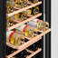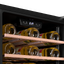 Внутреннее пространство организовано на шести деревянных полках из бука, которые мягко фиксируют бутылки и предотвращают вибрации. Вместимость до 34 бутылок по 0,75 л и полезный объем 85 литров подходят для домашней коллекции или небольшой подборки для обслуживания гостей. Вентиляция в корпусе улучшает циркуляцию воздуха и равномерность микроклимата, а электронный термостат поддерживает выбранные параметры.