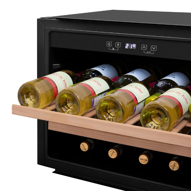 Габариты 45.5×59×56.3 см делают прибор подходящим для стандартных ниш под столешницу или для интеграции в колонну шкафов. Полезный объем 62 литра вмещает до 28 бутылок по 0.75 л, что удобно для небольшой коллекции или для резервного запаса напитков в заведении. Две деревянные полки из бука аккуратно удерживают бутылки и добавляют натуральной фактуры внутреннему пространству. Встроенная вентиляция предотвращает застой воздуха, а светодиодная подсветка равномерно освещает содержимое без нагрева.