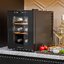 Стеклянная дверь — дополнительный изящный штрих к общему дизайну модели. Специальное покрытие защищает вино от влияния ультрафиолетовых лучей, которые проникают, если шкаф находится в солнечной комнате. Хранение становится еще безопаснее и герметичнее благодаря нескольким слоям стекол. Цвет корпуса — черный.