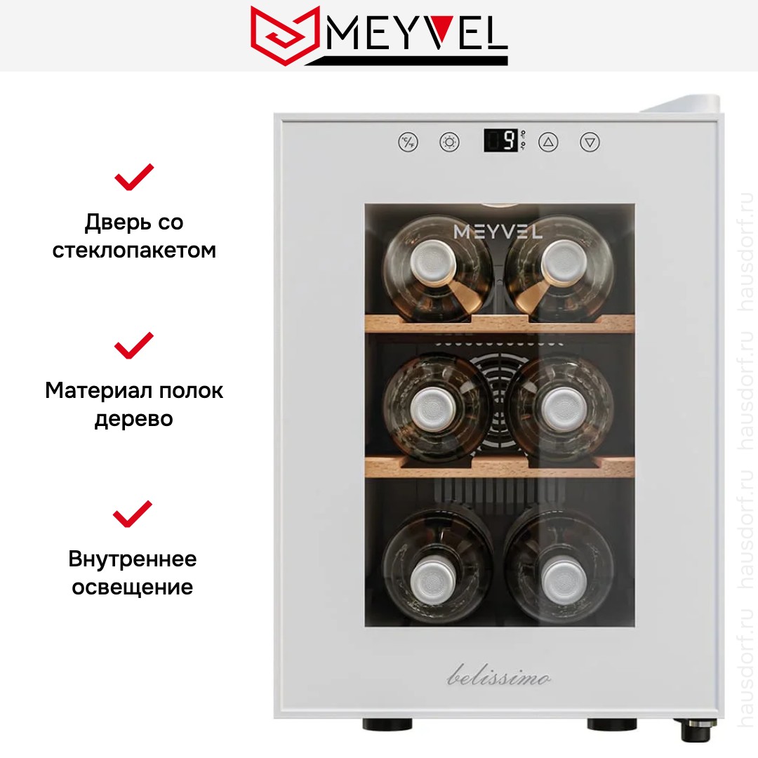 Винный холодильник Meyvel MV06-TWF1-Следующий имеет одну температурную зону, в которой можно разместить бутылки и единовременно выставить только одну комбинацию настроек. Он устанавливается отдельно, что удобно, если у вас есть специальное помещение — кладовая, погреб и т.д. Благодаря компактным размерам данная модель — отличный выбор для офиса, гостиничного номера. Количество бутылок, которое можно разместить с учетом полной комплектации и из расчета объема бутылки 0,75 л, — 6 шт.