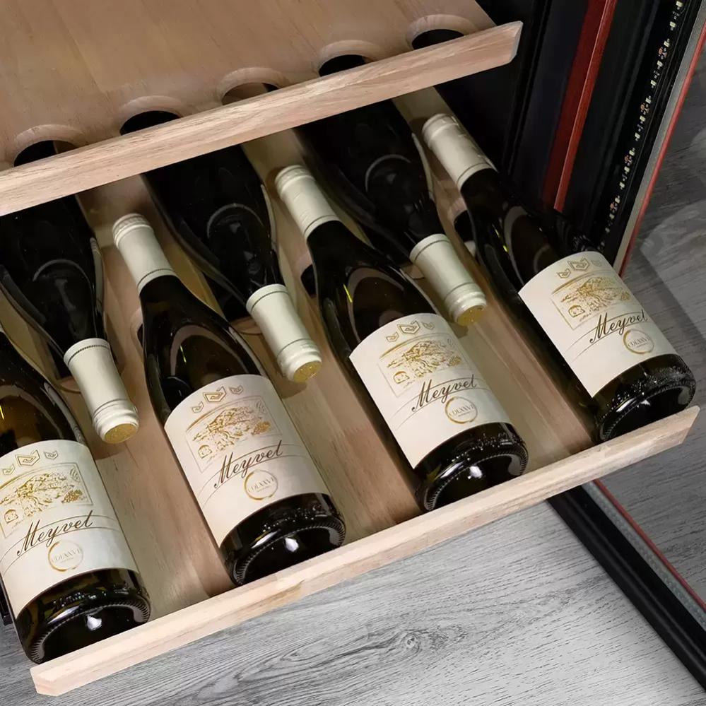 Полки в винных шкафах позволяют размещать бутылки для хранения в горизонтальном положении. Это необходимо, чтобы пробка постоянно смачивалась жидкостью и не пересыхала. Плотно закрытая пробка гарантирует, что внутрь бутылки не проникнет наружный воздух. Кислород, содержащийся в воздухе, может стать причиной ухудшения вкуса вина и даже его скисания. Кроме того, горизонтальное положение позволяет лучше оценить количество осадка. Материал изготовления полок выбирается, исходя из требований, предъявляемых к содержанию коллекции вин. Одним из основных требования является отсутствие или максимальное сокращение вибрации и хорошая фиксация бутылок на месте хранения. Даже если полка выдвигается, бутылки должны оставаться на своем месте. Второе требование исключает применение стеклянных полок, как в обычном холодильнике: на них почти невозможно зафиксировать бутылки.