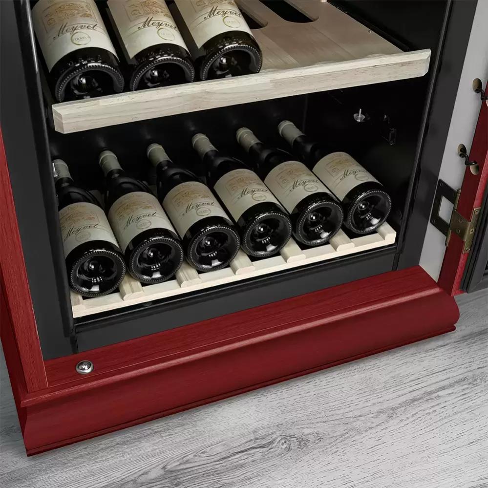 Стеклянная дверь — дополнительный изящный штрих к общему дизайну модели. Специальное покрытие защищает вино от влияния ультрафиолетовых лучей, которые проникают, если шкаф находится в солнечной комнате. Хранение становится еще безопаснее и герметичнее благодаря нескольким слоям стекол. Цвет корпуса — орех.