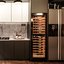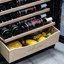 Встраиваемые холодильники для вина оснащаются специальной системой вентиляции: охлаждающая система у них находится в нижней части корпуса спереди. На такие устройства не навешивается мебельный фасад: дверца с затемненным стеклом остается на виду и открывается на достаточно широкий угол для свободного выдвижения деревянных полок.