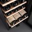 Стеклянная дверь — дополнительный изящный штрих к общему дизайну модели. Специальное покрытие защищает вино от влияния ультрафиолетовых лучей, которые проникают, если шкаф находится в солнечной комнате. Хранение становится еще безопаснее и герметичнее благодаря нескольким слоям стекол. Цвет корпуса — черный.