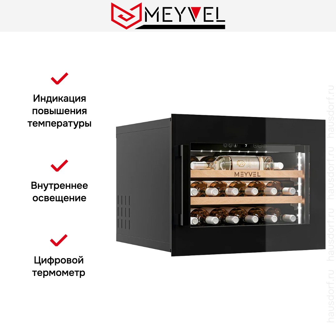 Винный холодильник Meyvel MV19PRO-KBB1 имеет одну температурную зону, в которой можно разместить бутылки и единовременно выставить только одну комбинацию настроек. Он встраивается в нишу, что удобно, если у вас ограничен метраж помещения. Благодаря компактным размерам данная модель — отличный выбор для офиса, гостиничного номера. Количество бутылок, которое можно разместить с учетом полной комплектации и из расчета объема бутылки 0,75 л, — 19 шт.