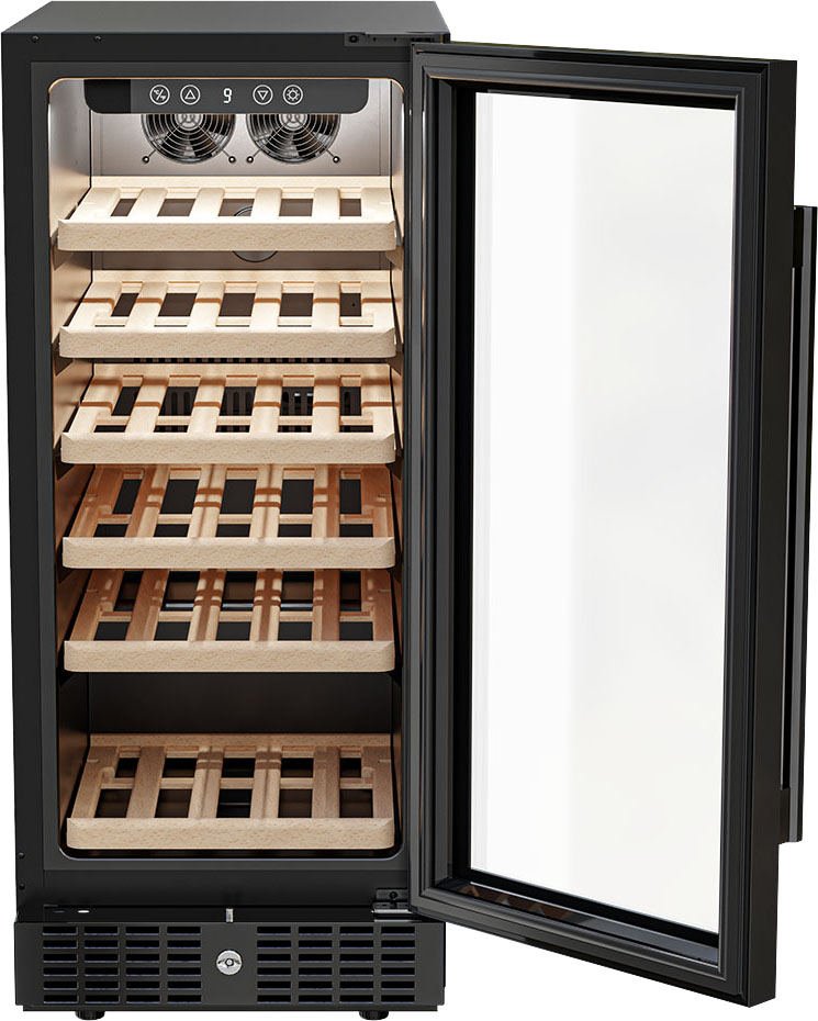Встраиваемые холодильники для вина оснащаются специальной системой вентиляции: охлаждающая система у них находится в нижней части корпуса спереди. На такие устройства не навешивается мебельный фасад: дверца с затемненным стеклом остается на виду и открывается на достаточно широкий угол для свободного выдвижения деревянных полок.