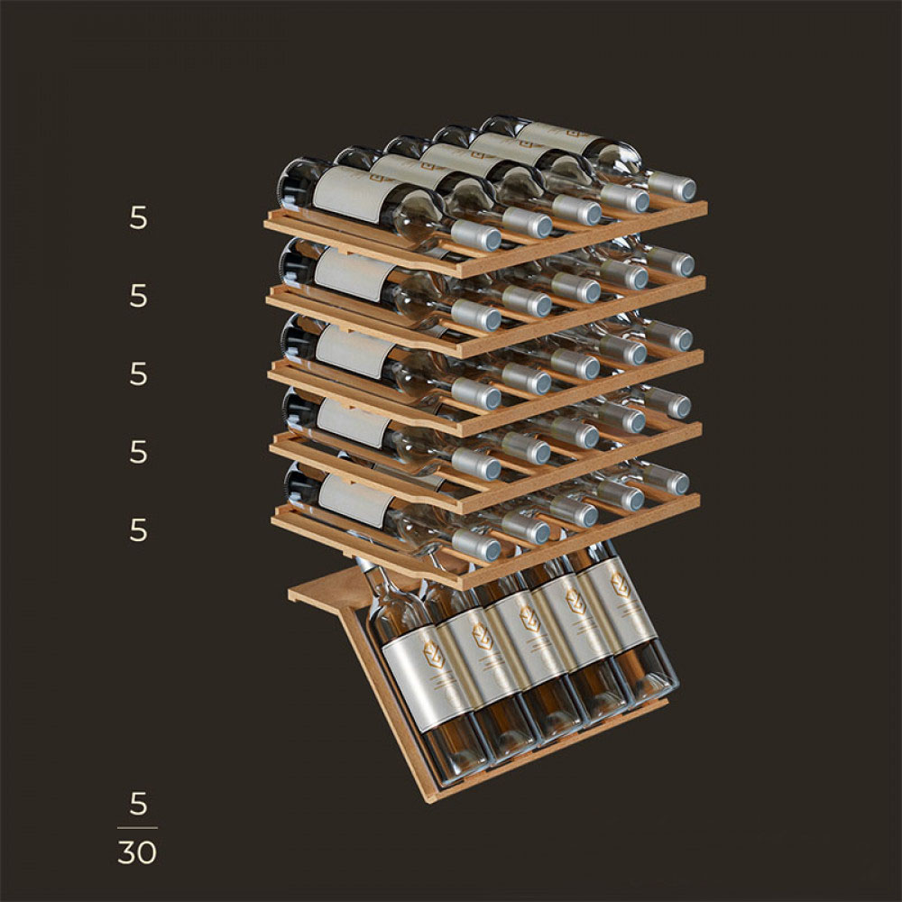 Электронное управление помогает быстро разобраться в том, как функционирует эта модель, и легко настроить все необходимые параметры. На дисплее отображаются данные, которые собирают датчики в камере. Цифровой термометр позволяет контролировать, соблюдаются ли оптимальные условия. Лампочки, расположенные внутри, хорошо подсвечивают бутылки. Всего полок, на которых можно разместить коллекцию, в шкафу 6 шт.
