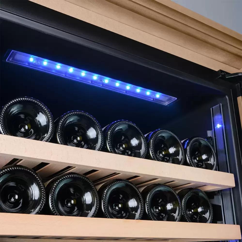 Кнопки для управления подсветкой выносятся на панель управления. Лампы синего, белого или голубого цветов могут располагаться в верхней части камеры или на боковых сторонах. Дополнительное освещение может устанавливаться в винных холодильниках с зоной для сервировки: она обеспечивает лучший обзор и доступ при подготовке вина к подаче.