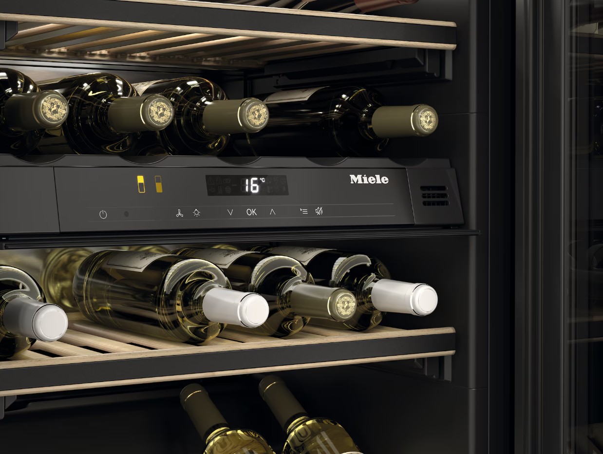 Винный холодильник Miele KWT 6422 iG Pearlbeige имеет две температурные зоны, в которых одновременно можно хранить разные сорта алкоголя и выставлять разные сочетания настроек. Он встраивается в нишу, что удобно, если у вас ограничен метраж помещения. Количество бутылок, которое можно разместить с учетом полной комплектации и из расчета объема бутылки 0,75 л, — 33 шт.