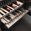 Встраиваемые холодильники для вина оснащаются специальной системой вентиляции: охлаждающая система у них находится в нижней части корпуса спереди. На такие устройства не навешивается мебельный фасад: дверца с затемненным стеклом остается на виду и открывается на достаточно широкий угол для свободного выдвижения деревянных полок.